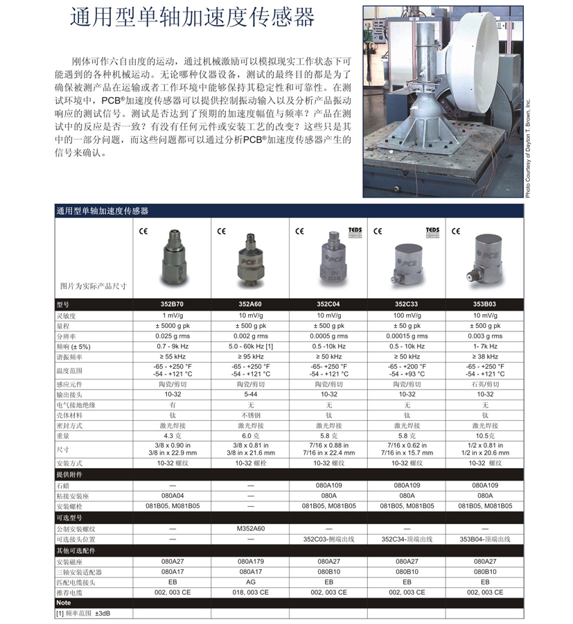 PCB Piezotronics制造精密型振動(dòng)加速度計(jì)以滿足振動(dòng)、沖擊、加速度測(cè)量和運(yùn)動(dòng)監(jiān)測(cè)、控制和測(cè)試應(yīng)用。PCB Piezotronincs提供ICP、PE、MEMS和電容傳感技術(shù)用于實(shí)現(xiàn)各種各樣的測(cè)量要求。PCB生產(chǎn)的加速度計(jì)有單軸、雙軸和三軸可選。這些產(chǎn)品用于工廠生產(chǎn)和設(shè)計(jì)人員以及研發(fā)組織的現(xiàn)場(chǎng)測(cè)試,從來獲取關(guān)鍵數(shù)據(jù)。除精密小型傳感器外,PCB的IMI部門還提供堅(jiān)固的加速度計(jì)和振動(dòng)傳感器用于工業(yè)機(jī)器振動(dòng)監(jiān)控。由于不同的測(cè)試和工業(yè)環(huán)境有不同的安裝條件,所以PCB制造的加速度計(jì)具有各種不同的靈敏度、溫度、頻率響應(yīng)、振幅響應(yīng)、外形和引線的接地配置以滿足不同的需求。加速度計(jì)來評(píng)估設(shè)備或結(jié)構(gòu)性能的關(guān)鍵因素,因此,這樣的應(yīng)用通常需要整個(gè)測(cè)量系統(tǒng)的校準(zhǔn)證明,從傳感器到*終的輸出。美國PCB加速度傳感器352C33的每個(gè)傳感器出貨時(shí)都隨貨附帶一個(gè)可溯源到NIST的校準(zhǔn)證書。