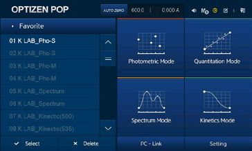 OPTIZEN POP共提供4種測量模式 (光度測量模式, 定量模式, 光譜模式, 動(dòng)力學(xué)模式), 用戶可根據(jù)測量目的選擇使用相應(yīng)的模式。用戶可以利用設(shè)備中內(nèi)置的電腦軟件和觸屏界面, 應(yīng)用程序來簡便地使用設(shè)備。