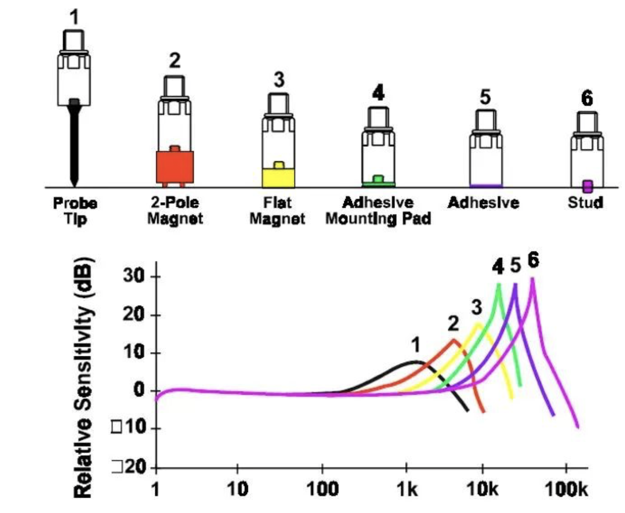 不同的安裝方式會顯著的影響傳感器的諧振頻率,也就是傳感器的高頻響應(yīng)。下圖有說明安裝方式對諧振頻率的影響。優(yōu)先選擇螺釘安裝,其次是熱熔膠或瞬干膠,然后雙面膠等等。