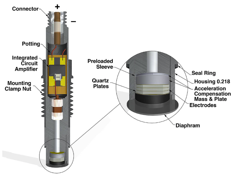 大多數(shù)PCB?壓電型壓力傳感器中的石英晶體在堅固的傳感器外殼內(nèi)采用壓縮式預緊,電氣石晶體采用無約束形式。這些設(shè)計使傳感器具有微秒級響應(yīng)時間和幾百赫茲的固有頻率,能夠*小化過沖或者振鈴現(xiàn)象發(fā)生的可能性。